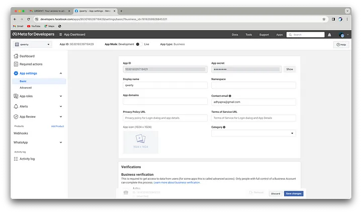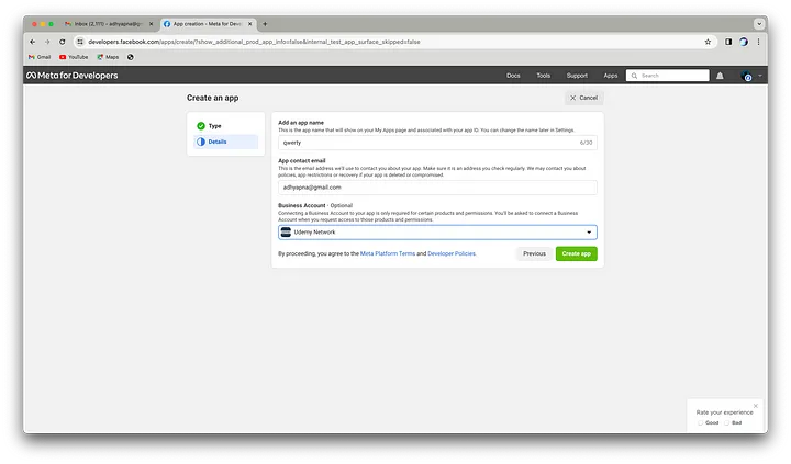 - Add an app name (e.g., “AIDemo”), enter your contact email, and provide your business portfolio optionally.
